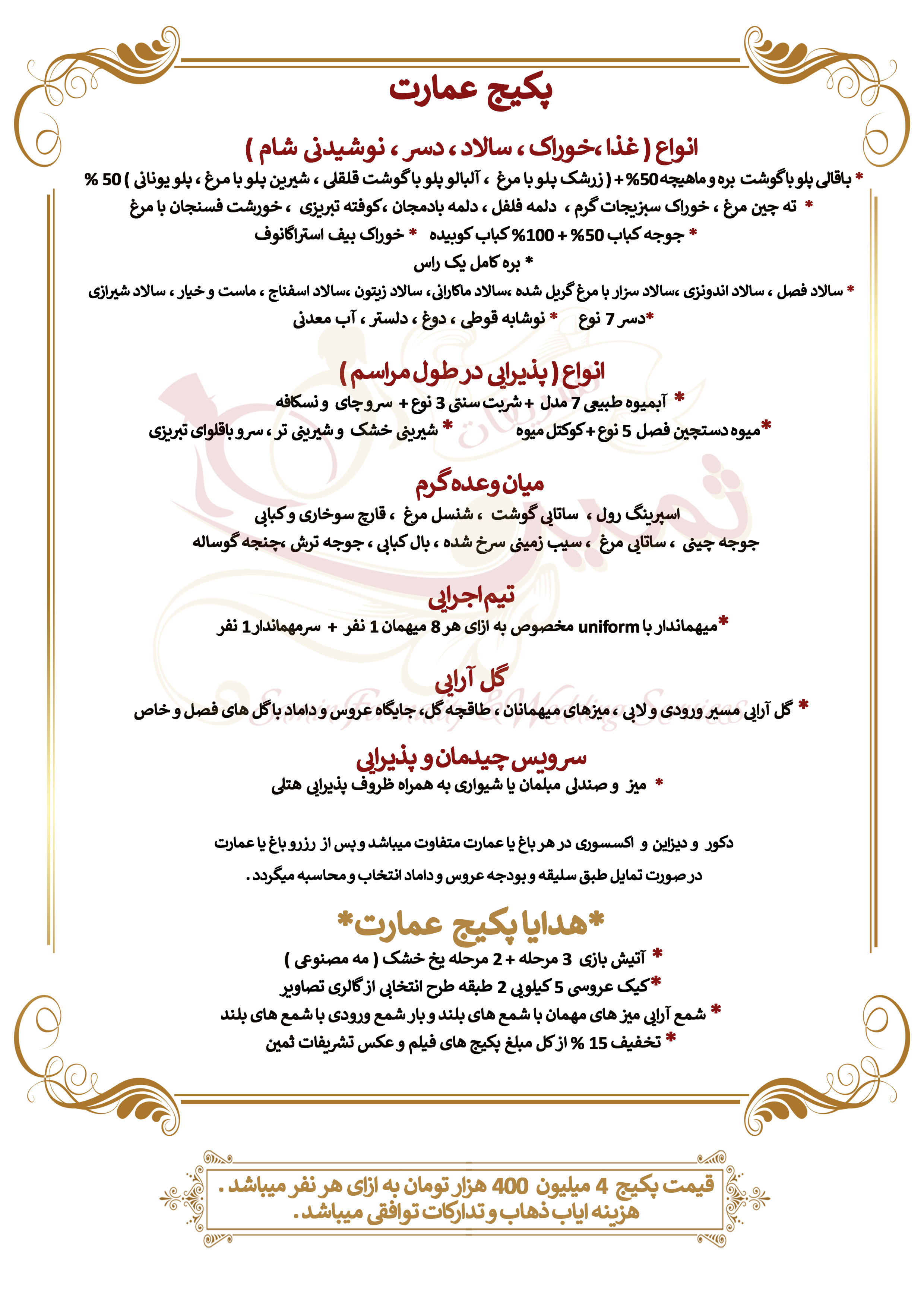 در صورت تمایل طبق سلیقه و بودجه عروس و داماد انتخاب و محاسبه میگردد .
